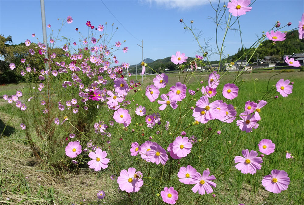 急に涼しくなりだした畑のあぜ道でコスモスの桃色の花が咲き始めていました。