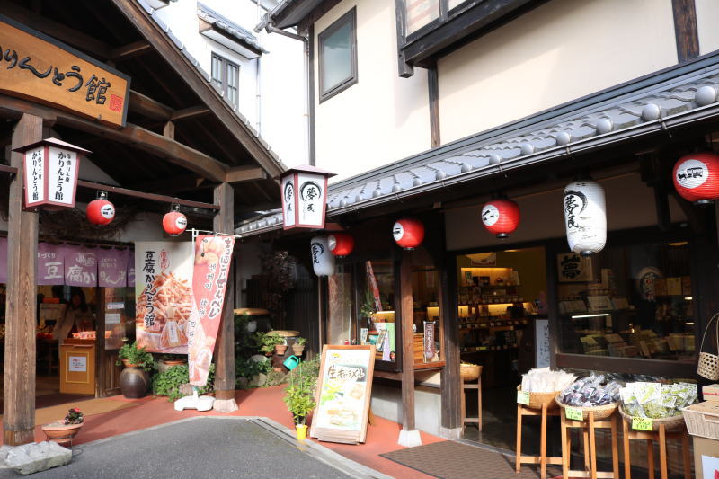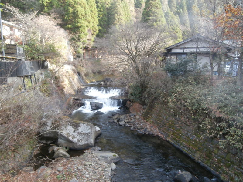 黒川温泉では川沿いに24軒の露天風呂を有する旅館が点在する
