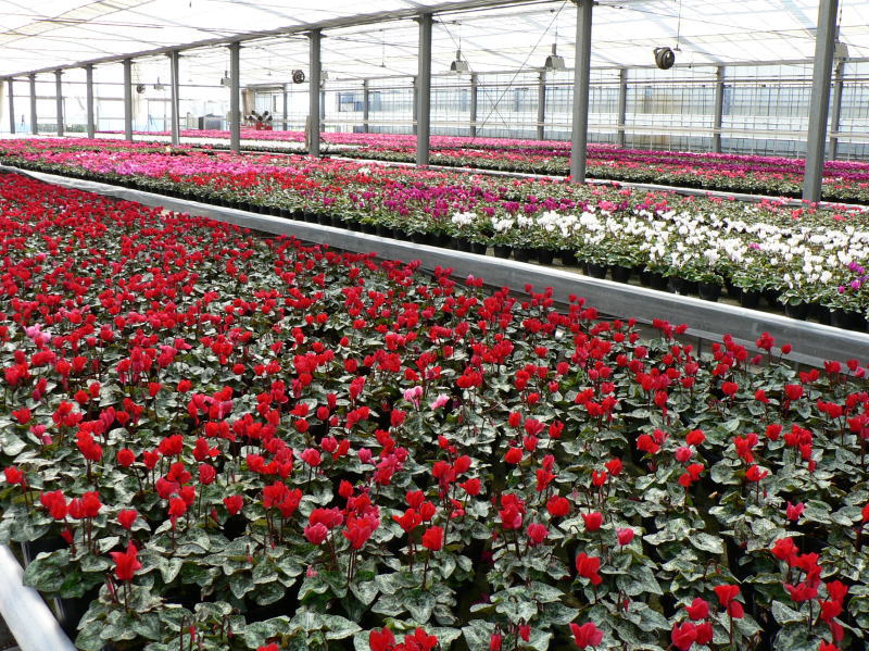 色とりどりのシクラメンが温室一面に栽培されていた