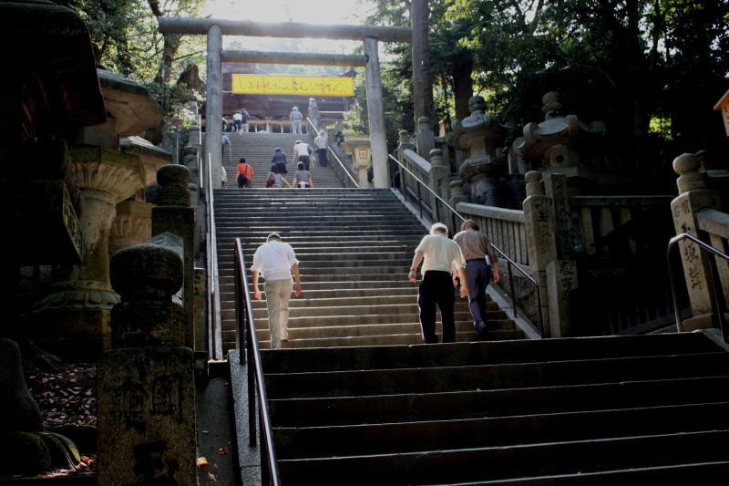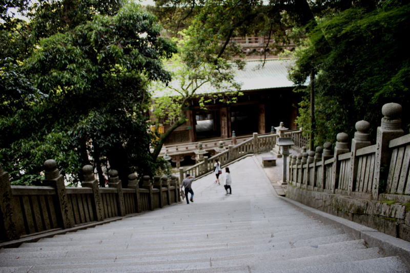長い石段の始まり、石段脇には燈明堂が昔のままで保存されている