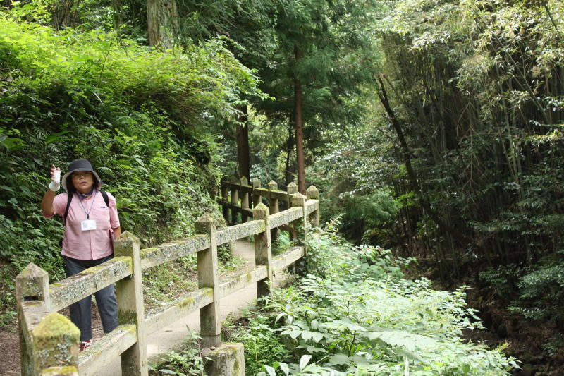 観光ガイドの説明を聞きながら山の中の遊歩道をゆく