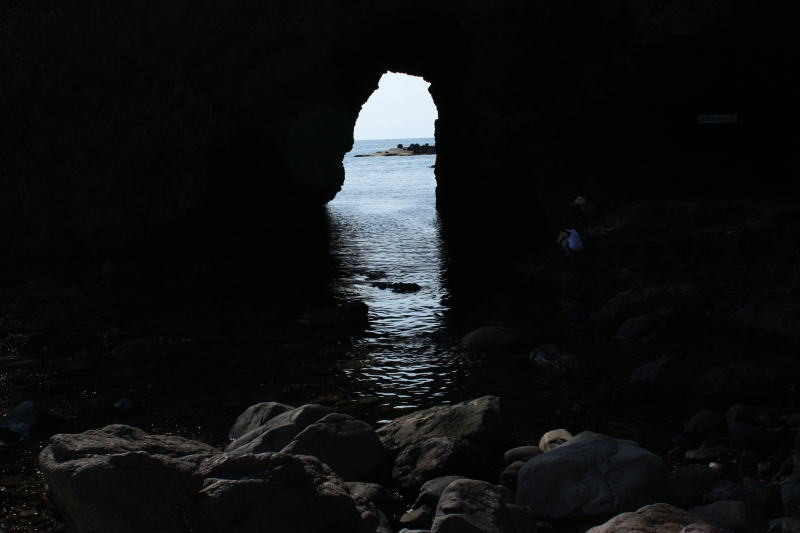 岩壁の下に幅6m、高さ15m、奥行60mの貫通洞門