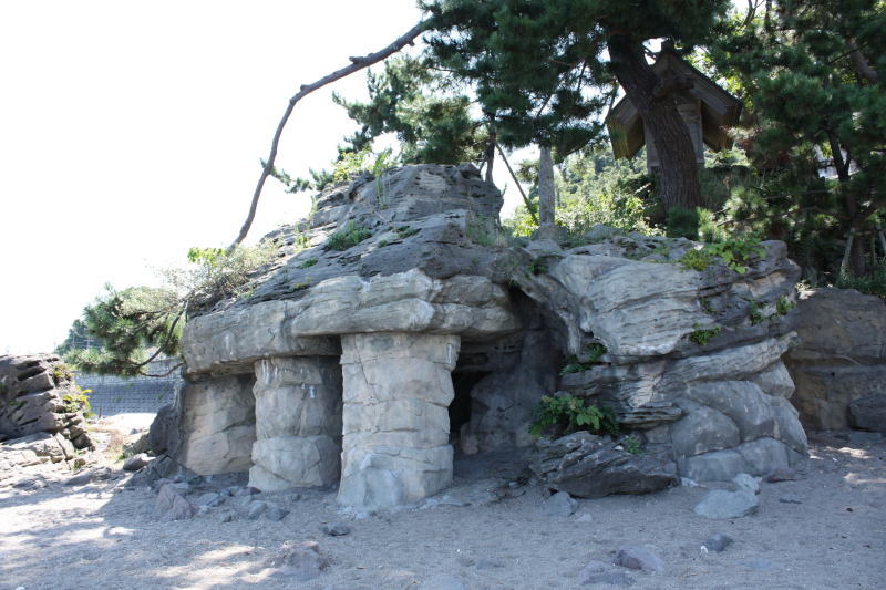源義経が奥州下りの際、この岩の下で雨宿りをしたという伝説がある