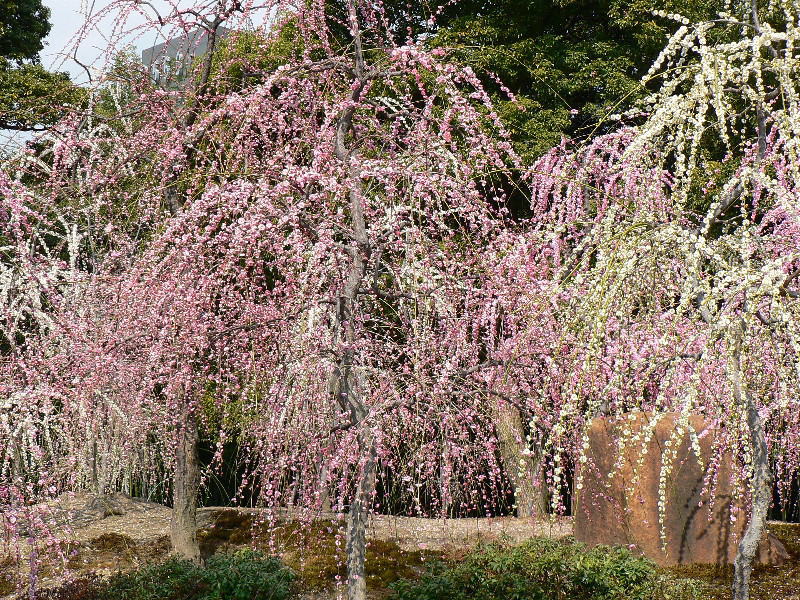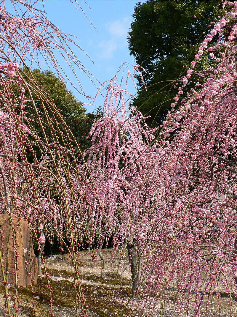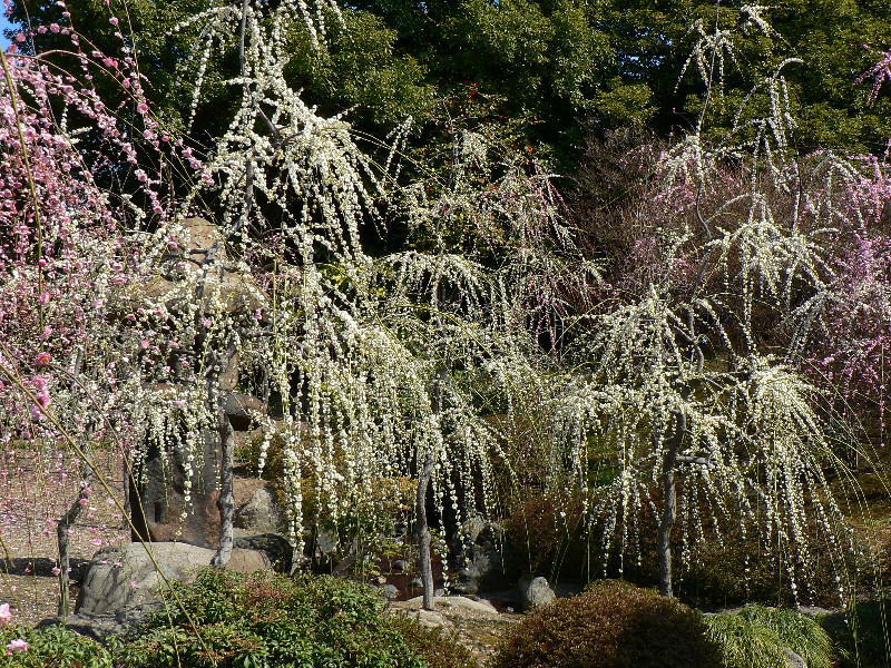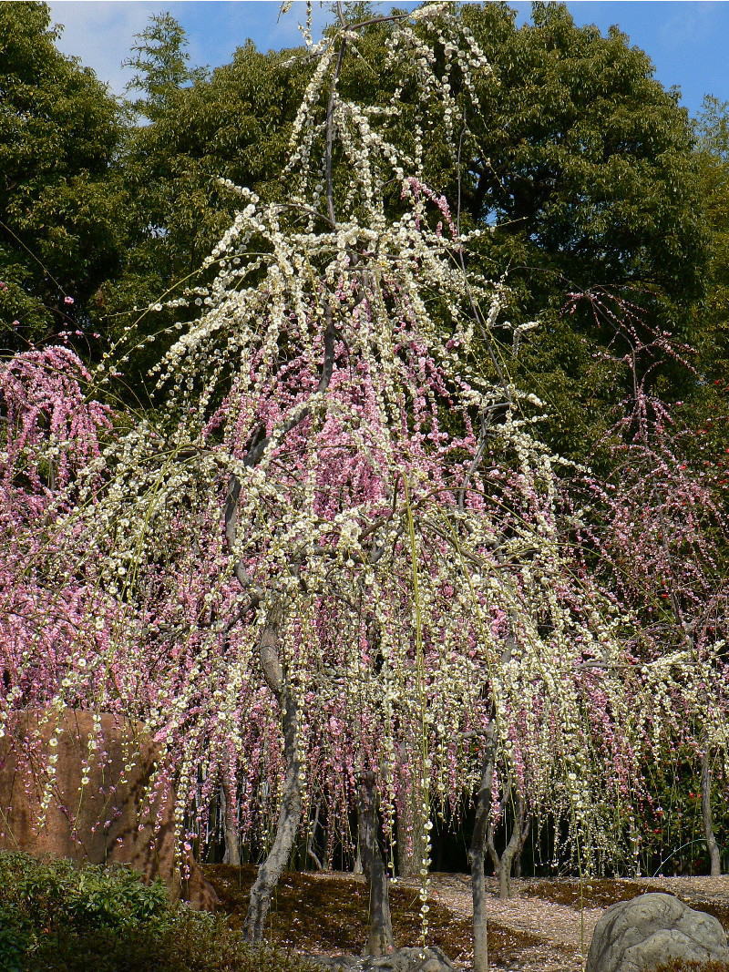 神苑『楽水苑』の春の山に咲く枝垂れ梅の数々 |