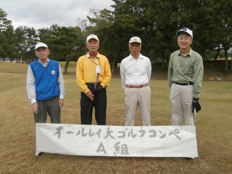 草津校、米原校合わせて学期では18期から37期の在校生まで、年齢では61歳から最高齢の88歳までの102名が一同に会して、素晴らしい秋晴れのもとでプレイを楽しむことができました。今回も100名を超える参加者となったので、年齢別に3班に別れてダブルペリア方式で順位を競い合いました。