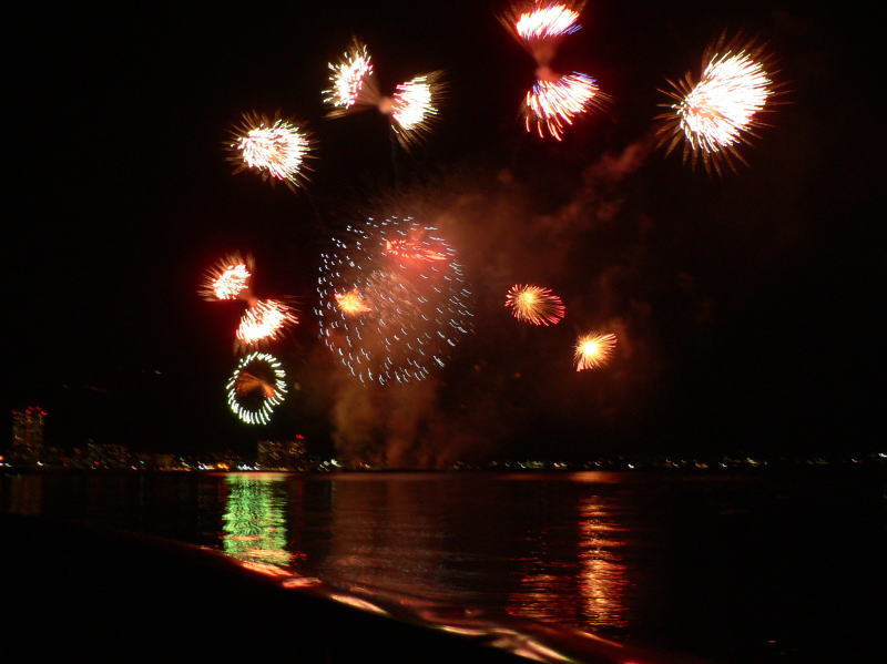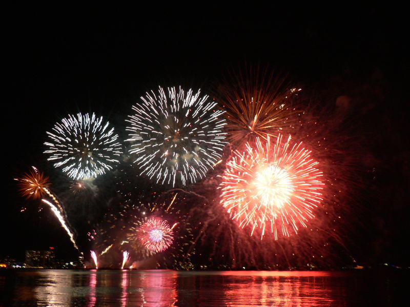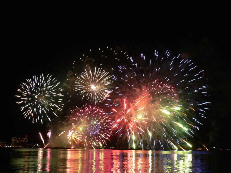 午後7時30分から約1万発の花火が湖上の2箇所から打ち上げられた