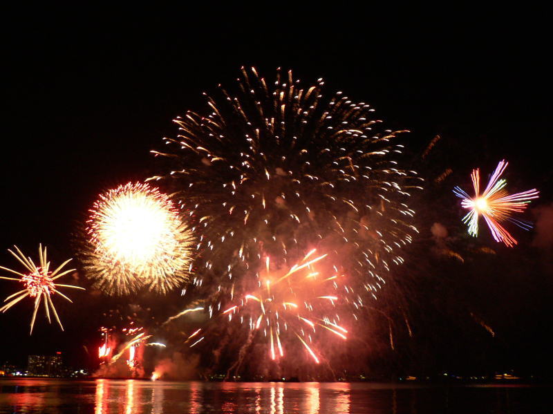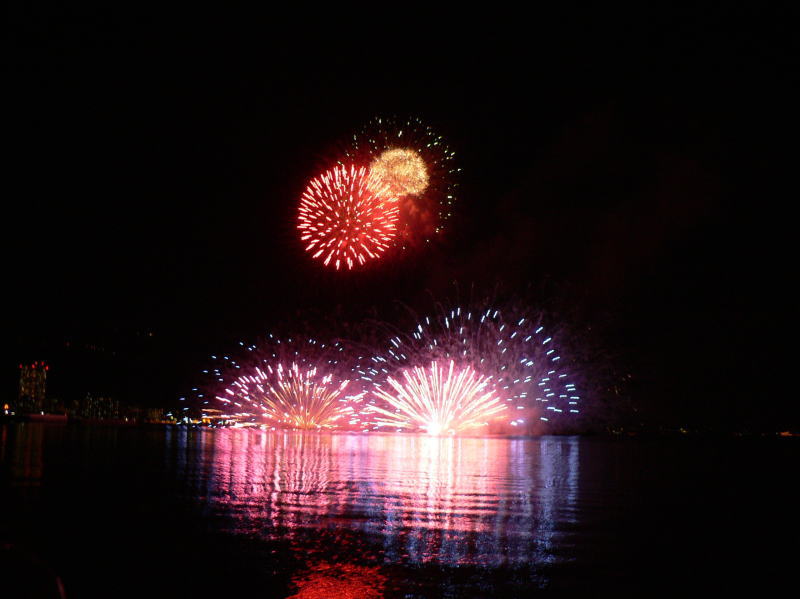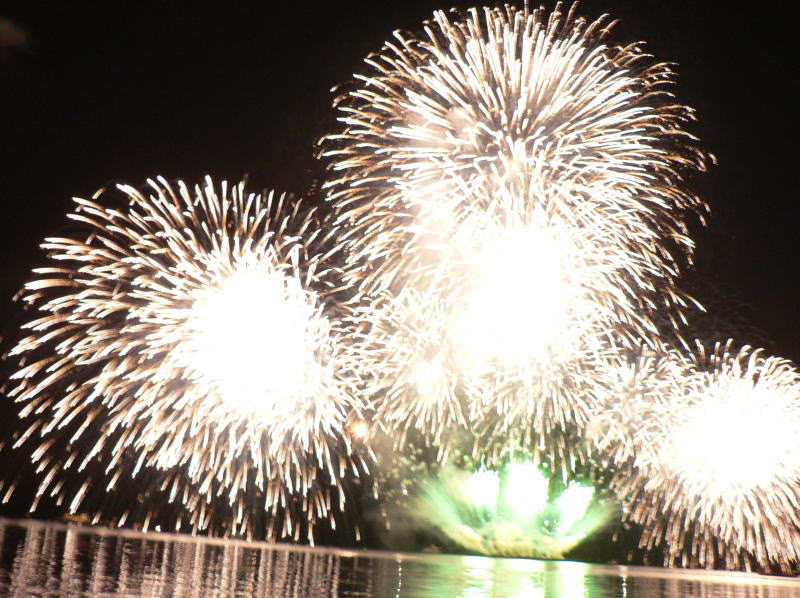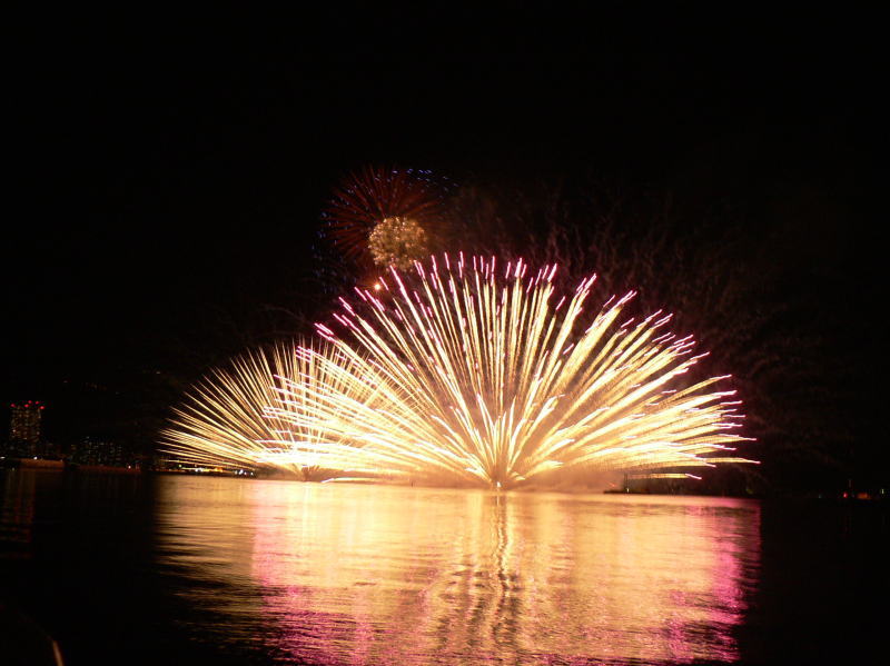 今年は夕方から涼しい風もあり、打ち上げ後の煙に遮られることもなく最高の花火を楽しむことができました。また湖面にぎりぎりの席が確保でき例年と違う湖面に映る花火を満喫することができました。一瞬の美をなんとかカメラに収めたいと言う好奇心に駆られていますが、年々その難しさを痛感するばかりです。 【2007・8・9記】 |