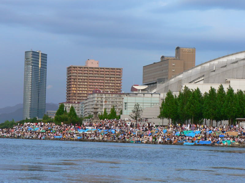 花火大会の会場となった浜大津港と有料観覧席の椅子の列