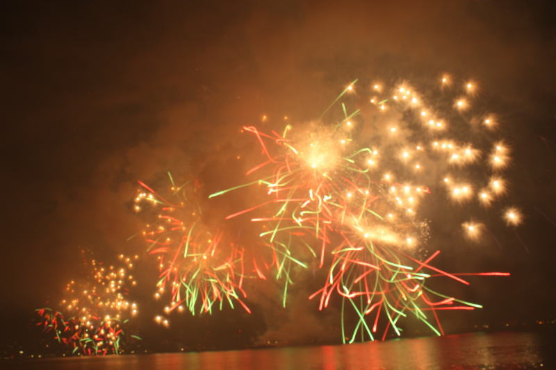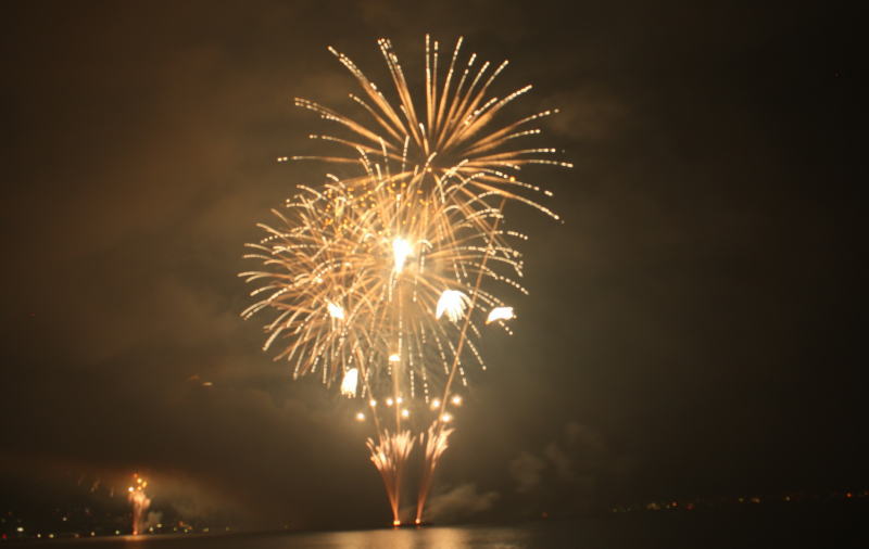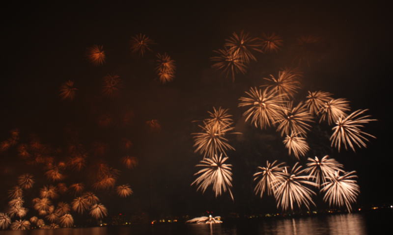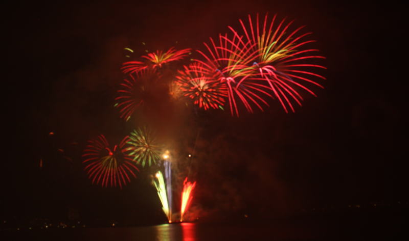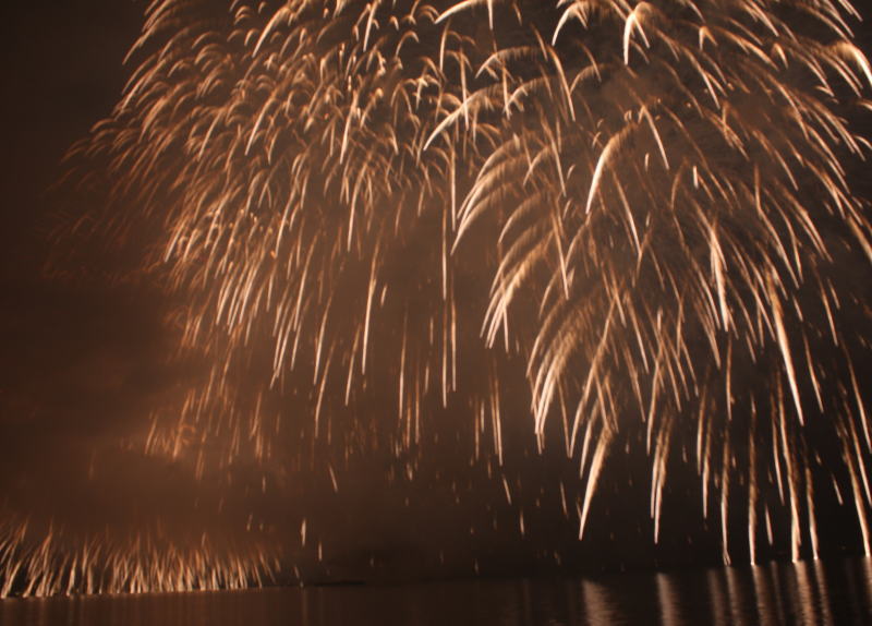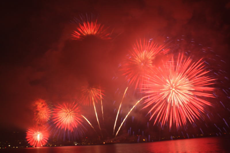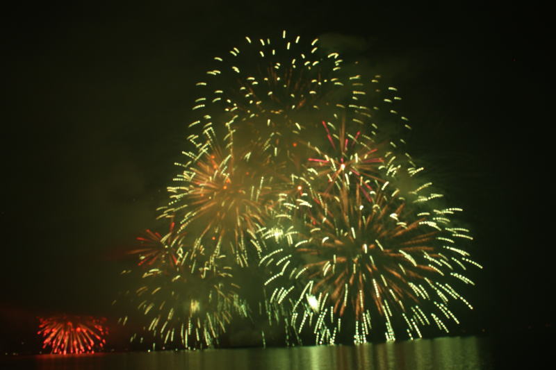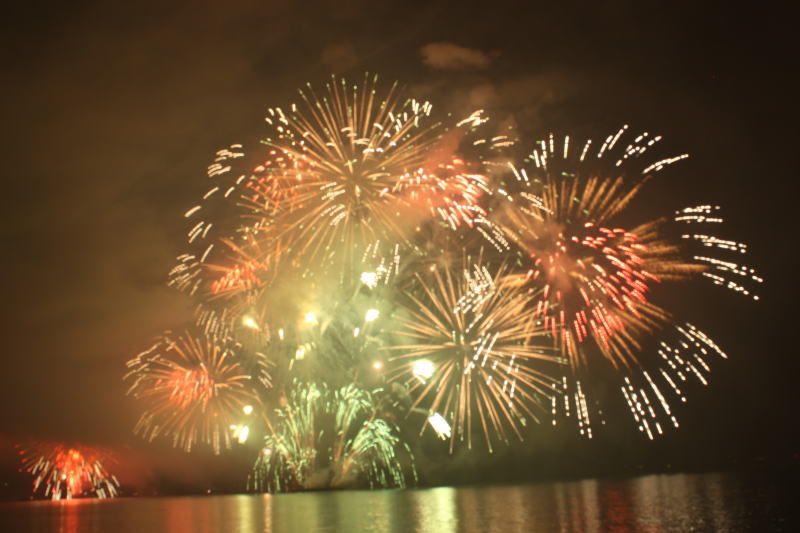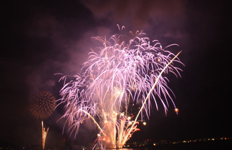 びわ湖大花火大会は30回記念を迎えますが、今年のテーマは「四季めぐり」と題して“春〜花めぐり〜”“夏〜水辺めぐり”“秋〜紅葉めぐり”“冬〜自然めぐり”を花火で表現し、約10000発の花火が打ち上げられました。 今年は夕方に激しい夕立の雨が降り花火が始まる頃には止み、少しは涼しく感じました。しかし雨上がりの無風状態で花火が打ち上がるに連れて煙が停滞し、鮮やかな花火が見れなかったのは残念でした.