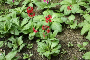 | ツツジ園脇のせせらぎには種々なクリンソウが咲いている |