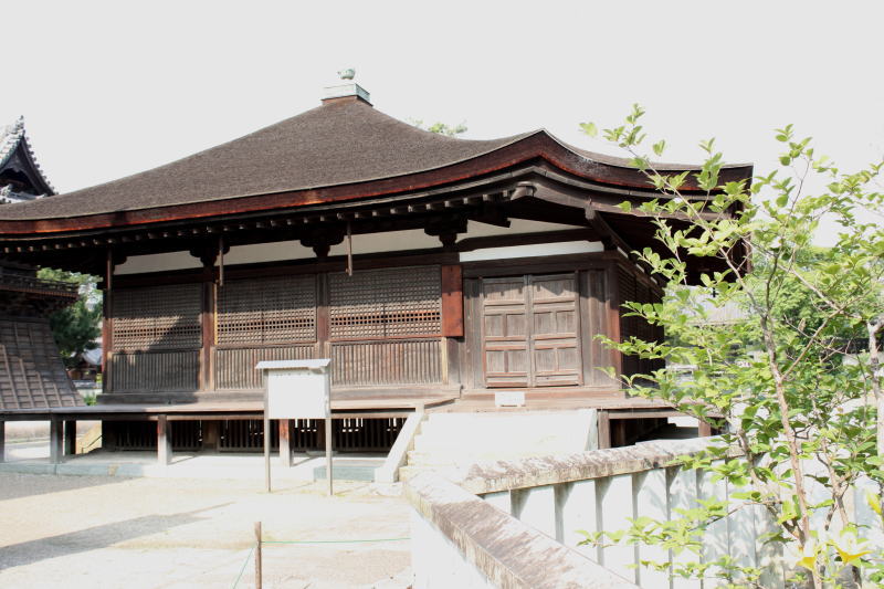 如来を祀る国宝・本堂を正面に、右側に桧皮葺きの屋根