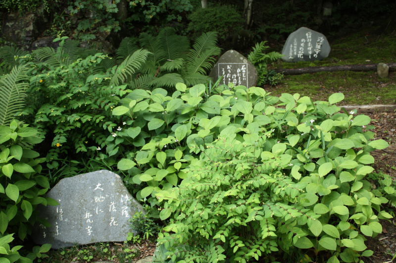 本堂横から裏山へ巡る散策路には寺にゆかりの句碑や歌碑が点在する