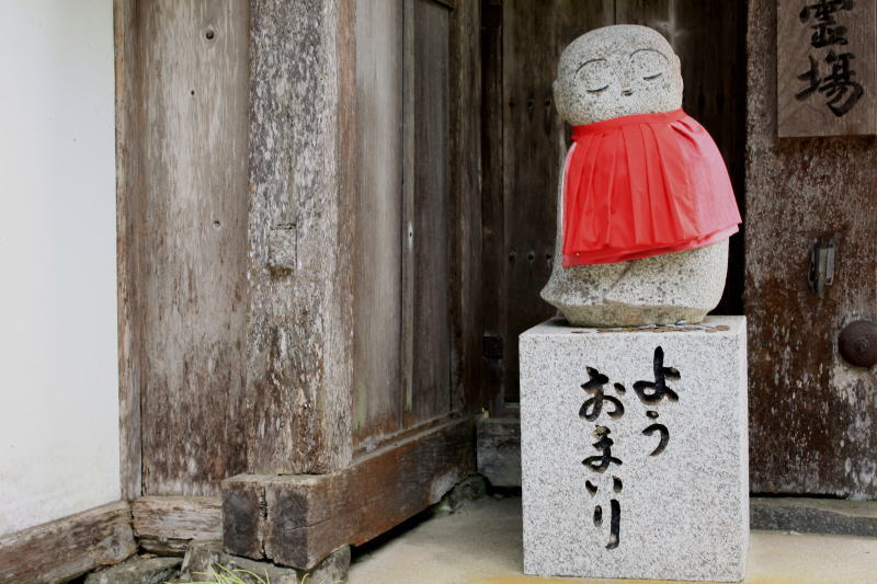 庫裡の山門に訪れる人を迎えるわらべ地蔵