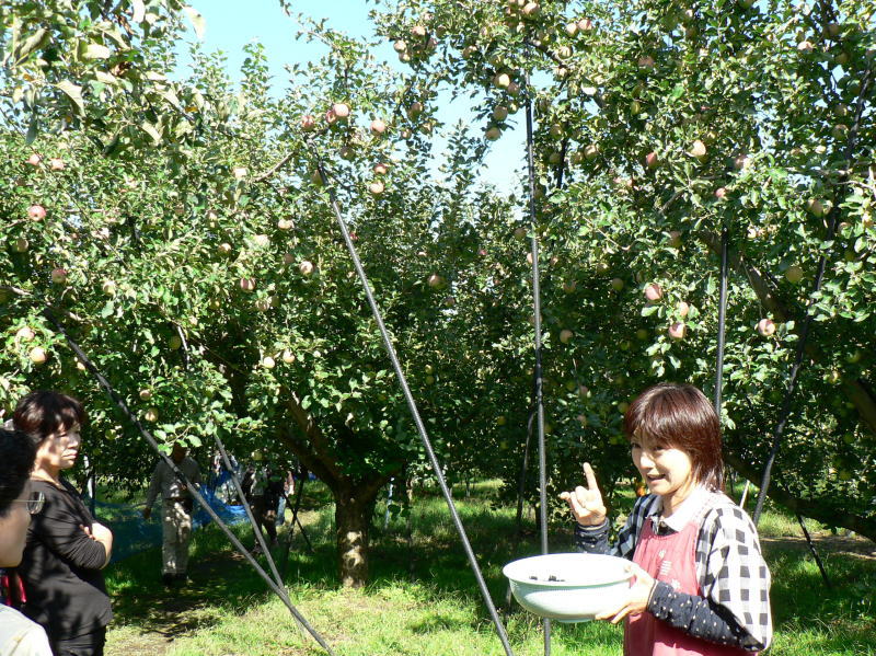 農園の人からりんご狩りと梨狩りの説明を聞く