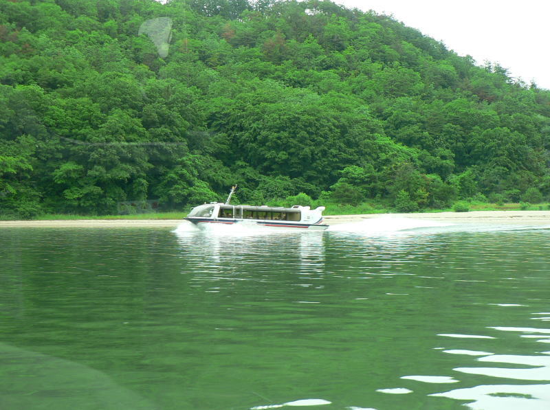 新緑をバックに周遊する高速ジェット船