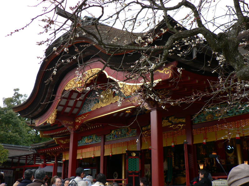 本殿の右前の御神木「飛梅」も咲き始めていた |