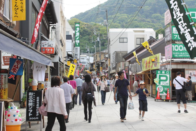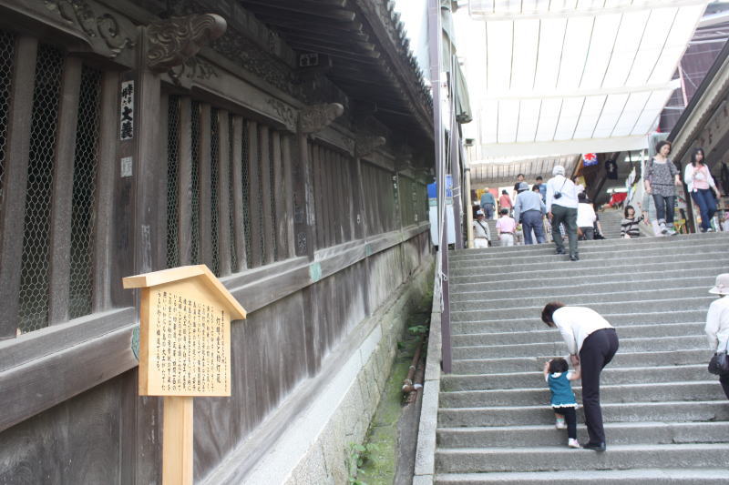 長い石段の始まり、石段脇には燈明堂が昔のままで保存されている