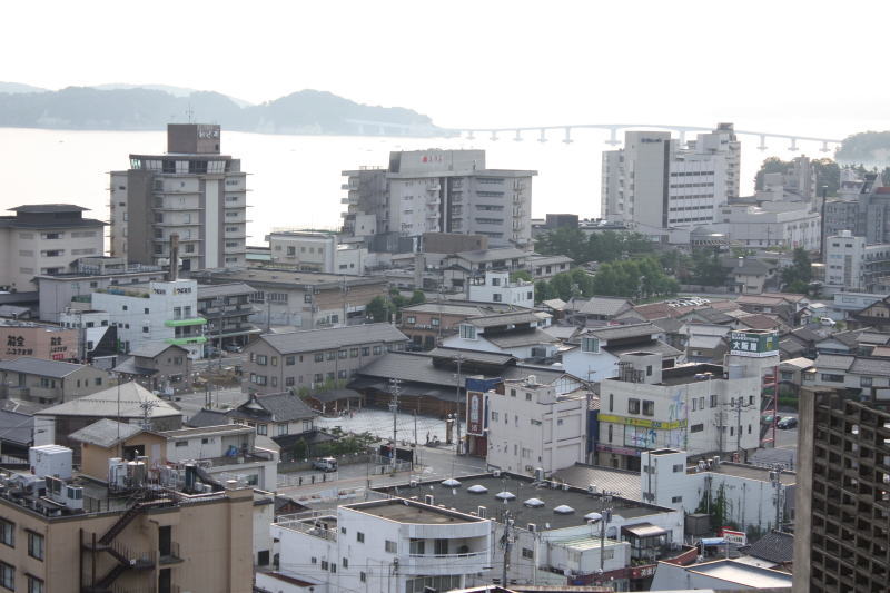 開湯1200年とされる歴史の古い温泉街、前方に架かるのは能登島大橋