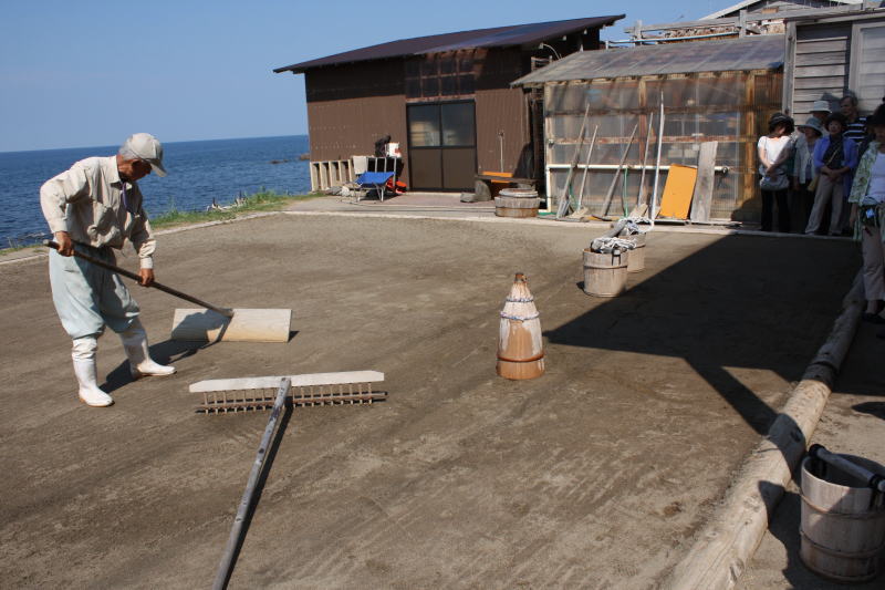 仁江海岸で日本で唯一受け継がれてきた揚浜式塩田法を見学