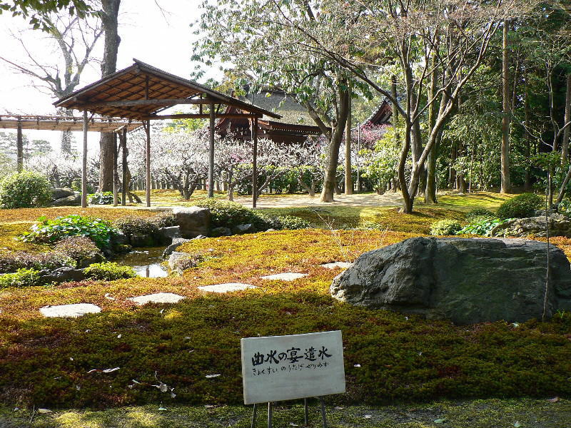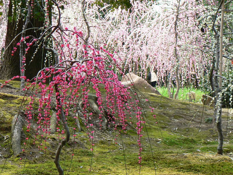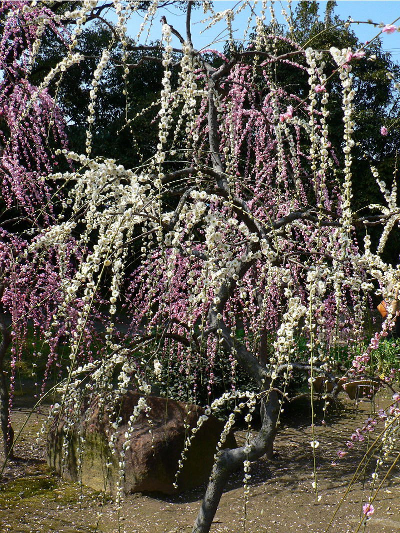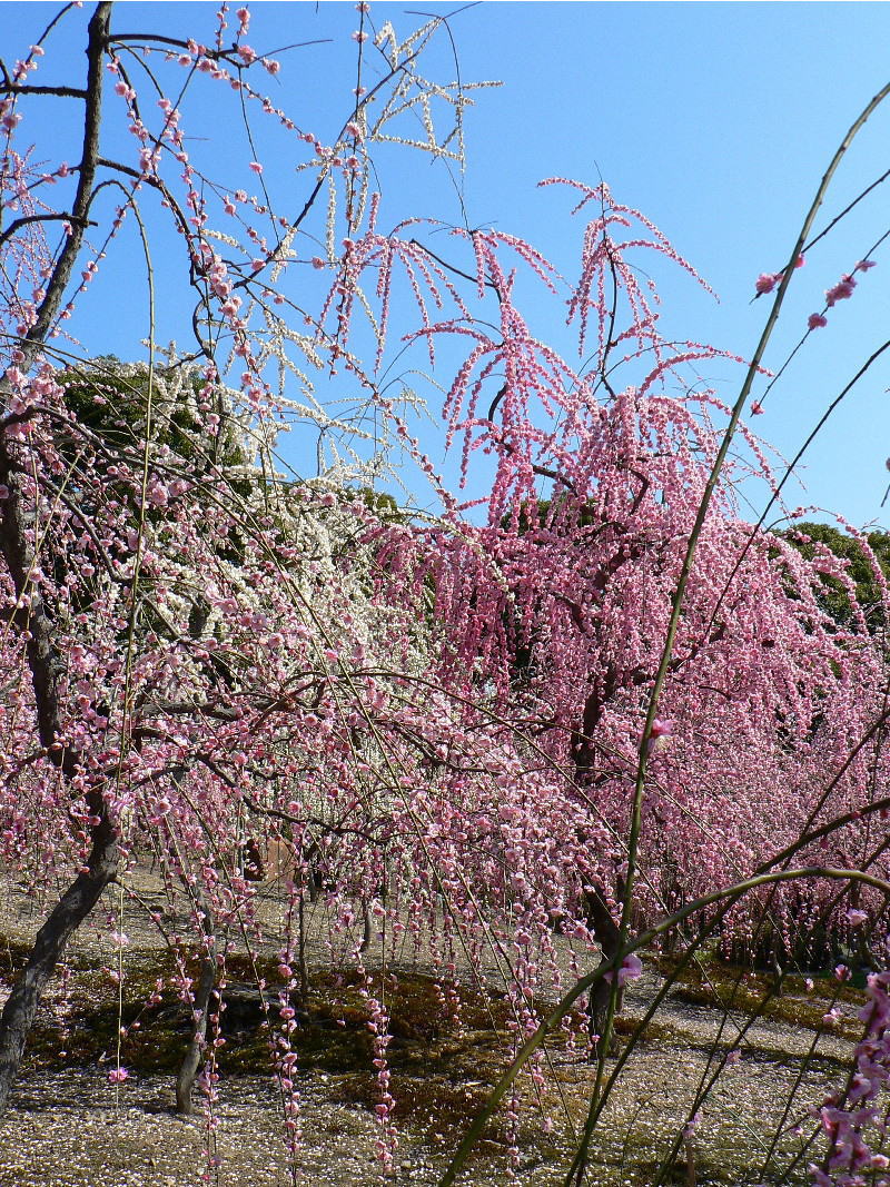 神苑『楽水苑』の春の山に咲く枝垂れ梅の数々 |