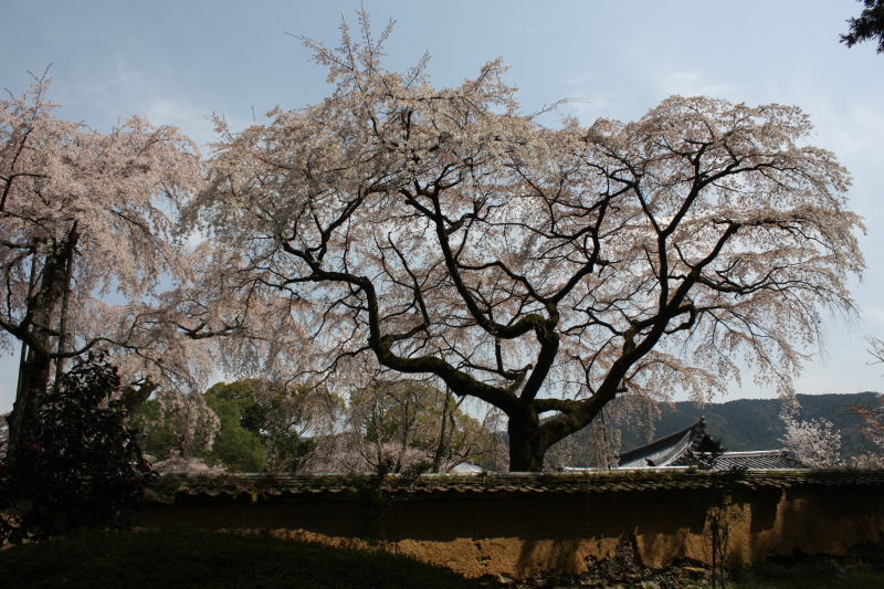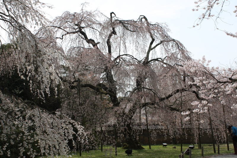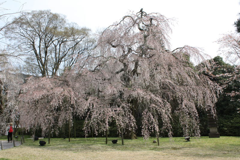 名所に比べて早く咲くのか名高いしだれ桜も花吹雪の