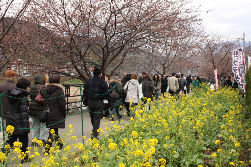 本場河津川沿いの「菜の花ロード」の河津桜はちらほら咲き