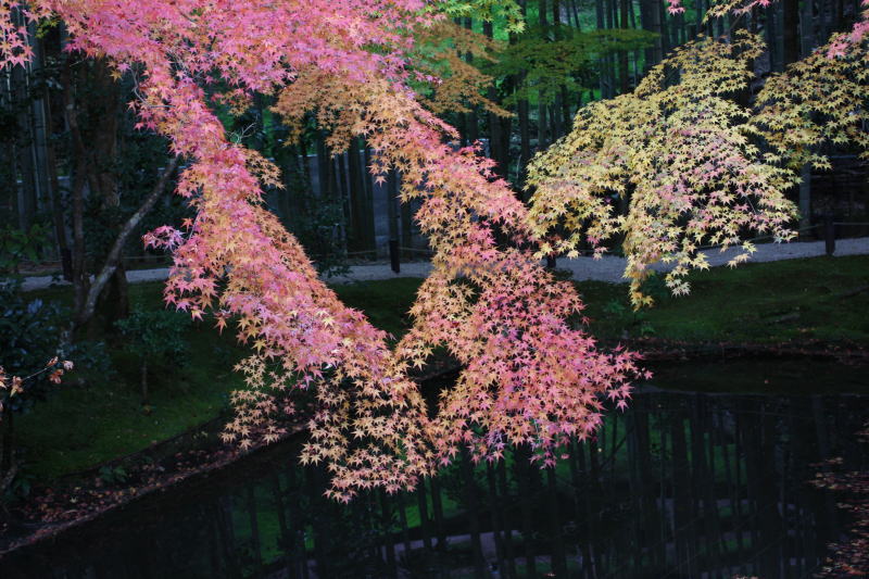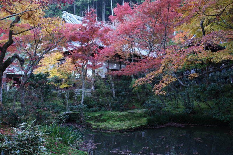 庭園南側にある洛北最古の泉水「栖龍池」の紅葉