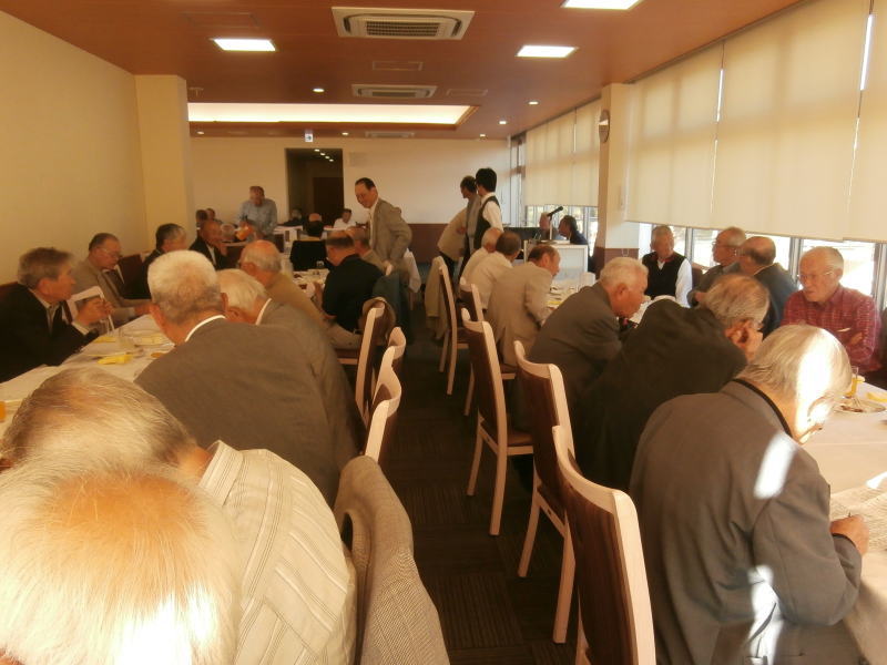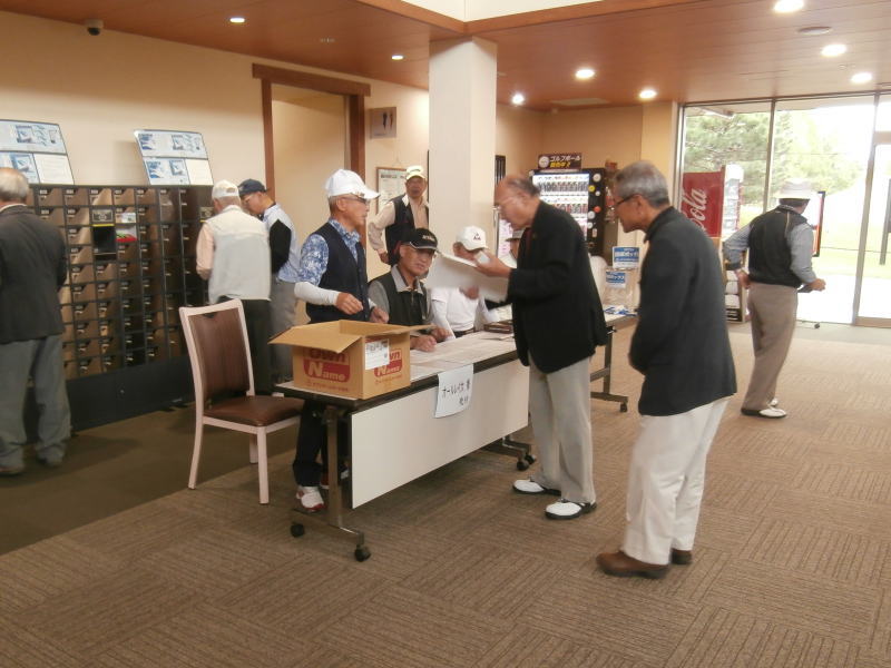 草津校、米原校合わせて学期では18期から37期の在校生まで、年齢では61歳から最高齢の88歳までの102名が一同に会して、素晴らしい秋晴れのもとでプレイを楽しむことができました。今回も100名を超える参加者となったので、年齢別に3班に別れてダブルペリア方式で順位を競い合いました。