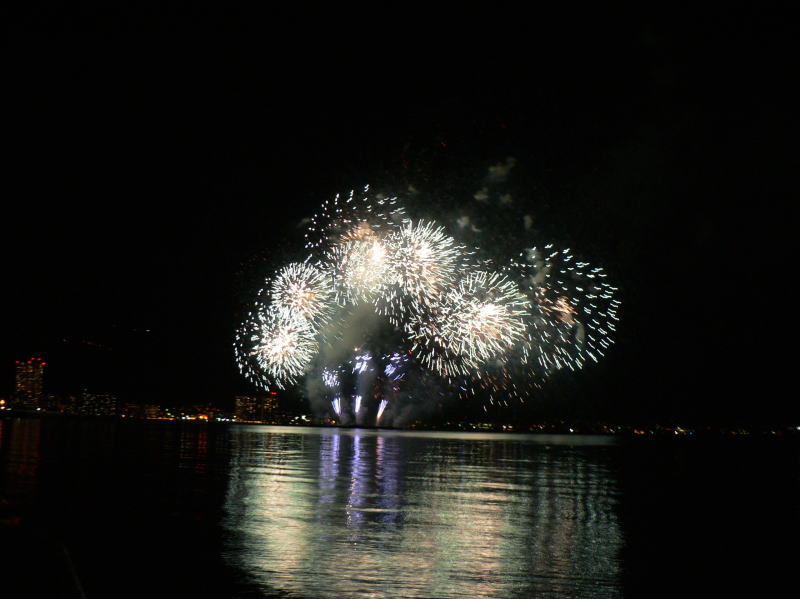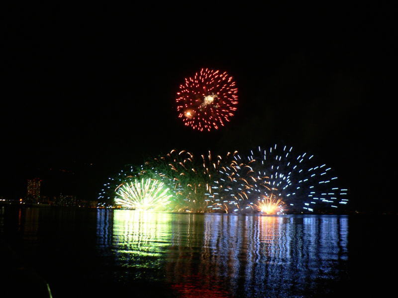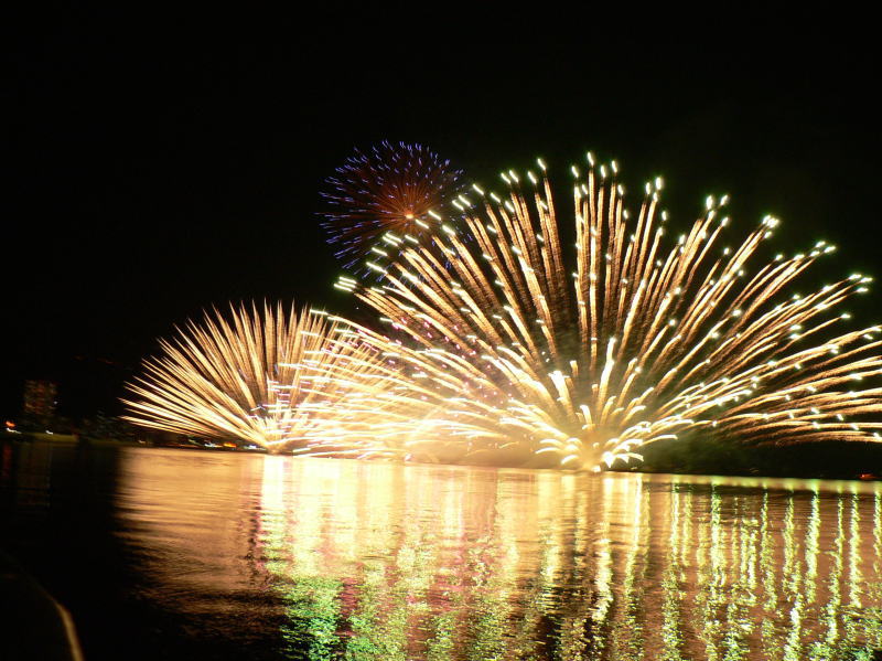 今年は夕方から涼しい風もあり、打ち上げ後の煙に遮られることもなく最高の花火を楽しむことができました。また湖面にぎりぎりの席が確保でき例年と違う湖面に映る花火を満喫することができました。一瞬の美をなんとかカメラに収めたいと言う好奇心に駆られていますが、年々その難しさを痛感するばかりです。 【2007・8・9記】 |