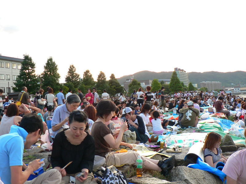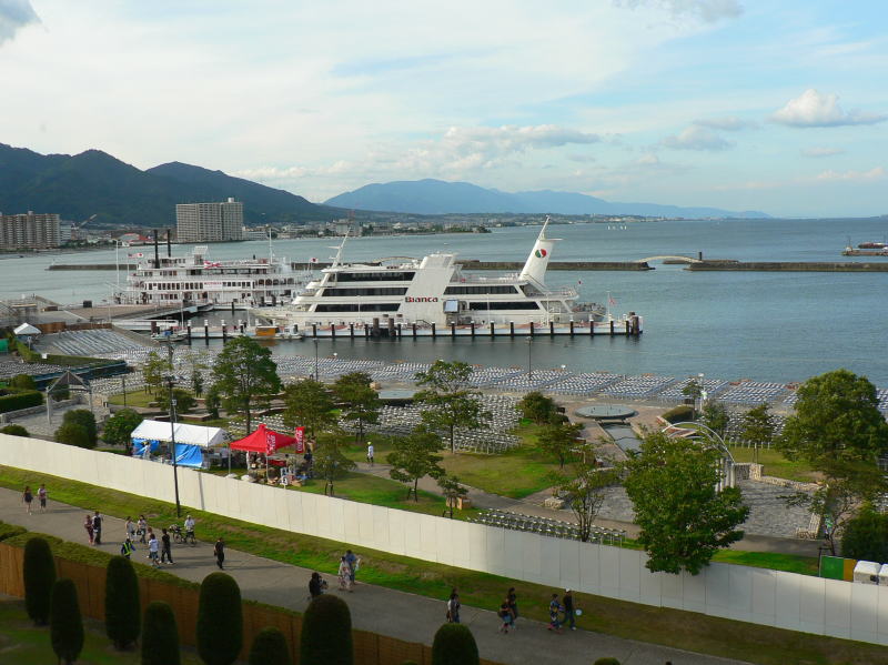花火大会の会場となった浜大津港と有料観覧席の椅子の列