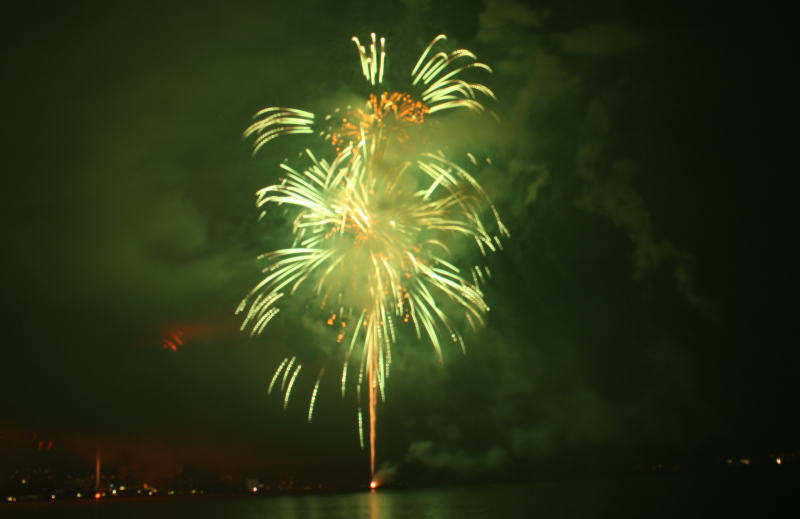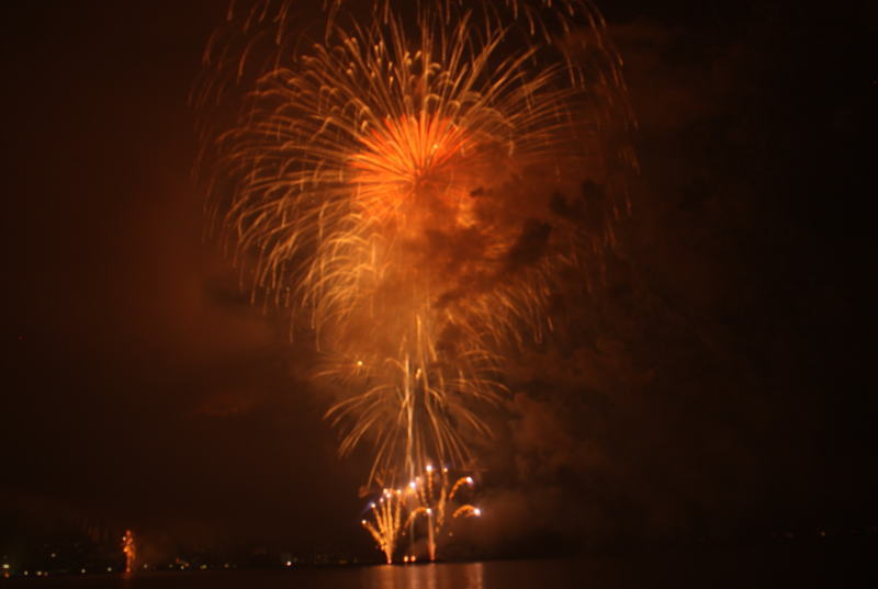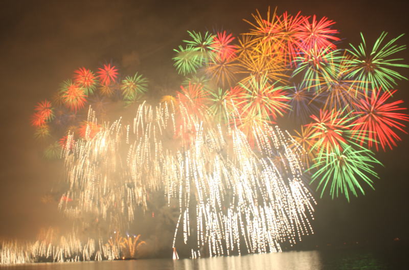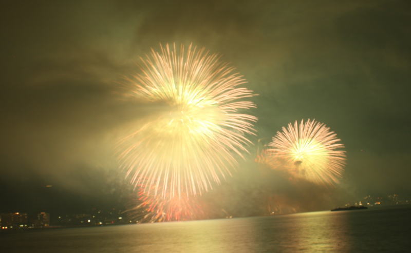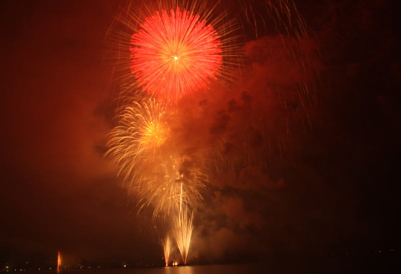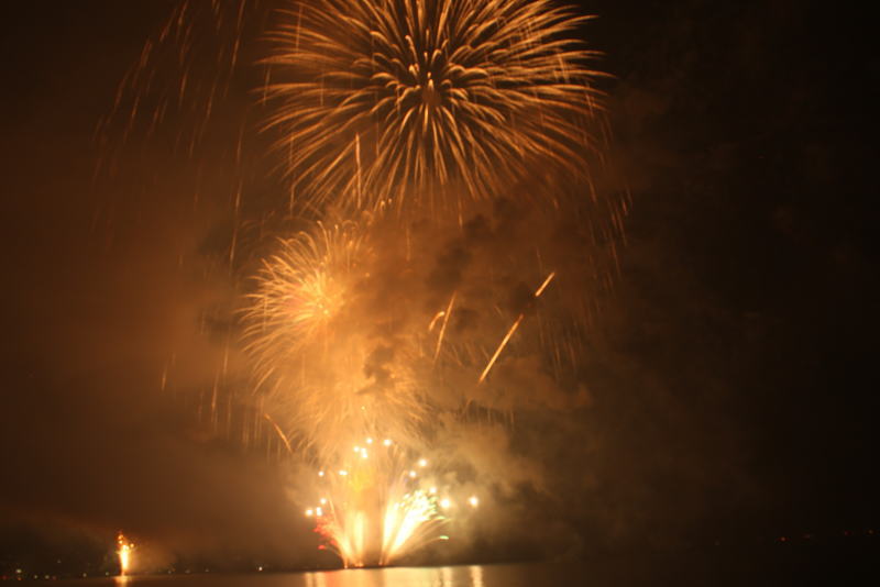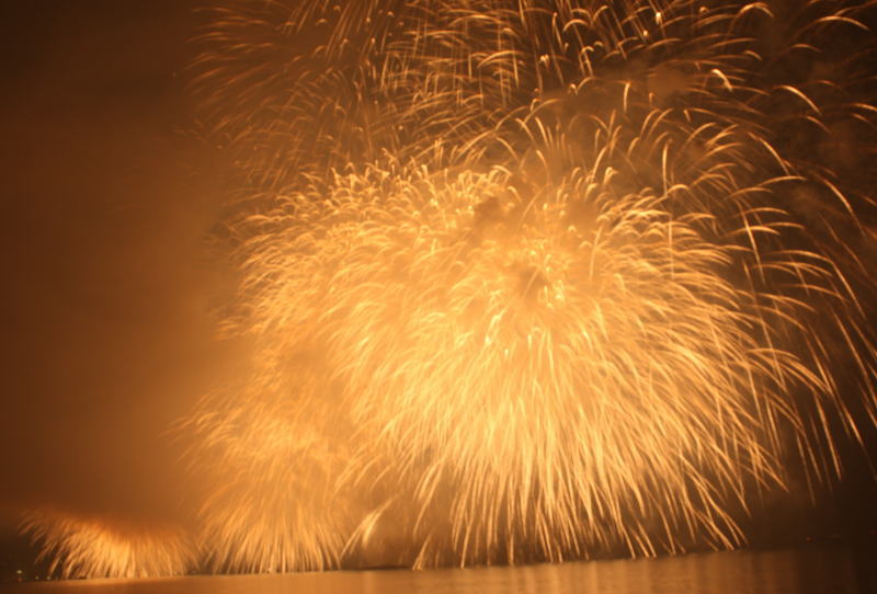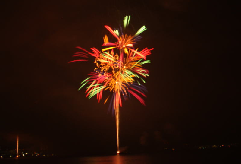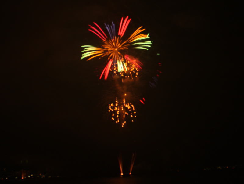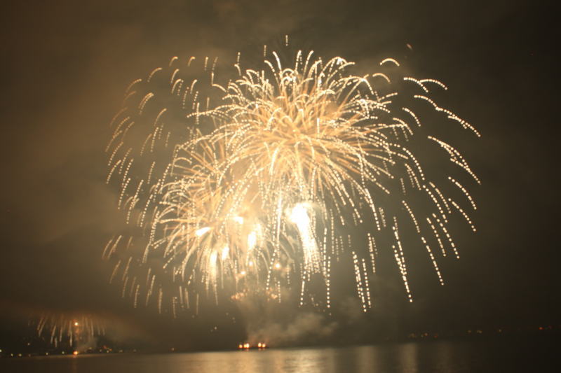 びわ湖大花火大会は30回記念を迎えますが、今年のテーマは「四季めぐり」と題して“春〜花めぐり〜”“夏〜水辺めぐり”“秋〜紅葉めぐり”“冬〜自然めぐり”を花火で表現し、約10000発の花火が打ち上げられました。 今年は夕方に激しい夕立の雨が降り花火が始まる頃には止み、少しは涼しく感じました。しかし雨上がりの無風状態で花火が打ち上がるに連れて煙が停滞し、鮮やかな花火が見れなかったのは残念でした.