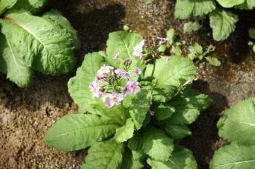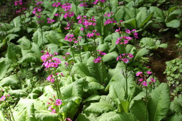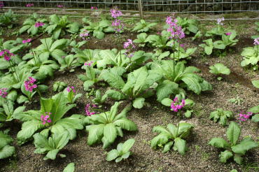 | ツツジ園脇のせせらぎには種々なクリンソウが咲いている |