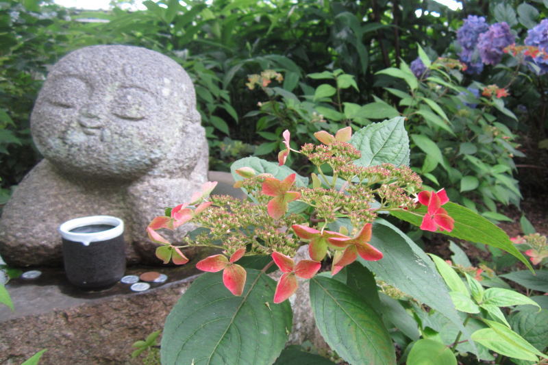 庫裡の山門に訪れる人を迎えるわらべ地蔵