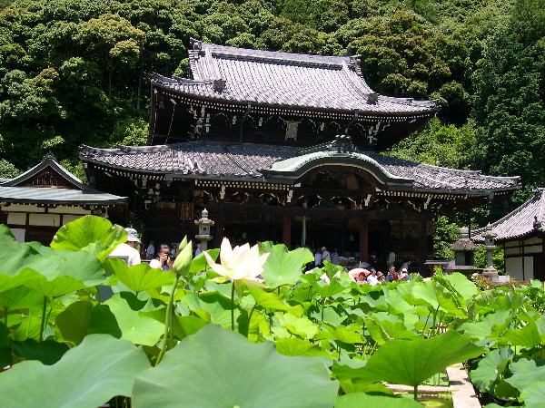本堂の前に植えられたハスには花が咲き始めていた
