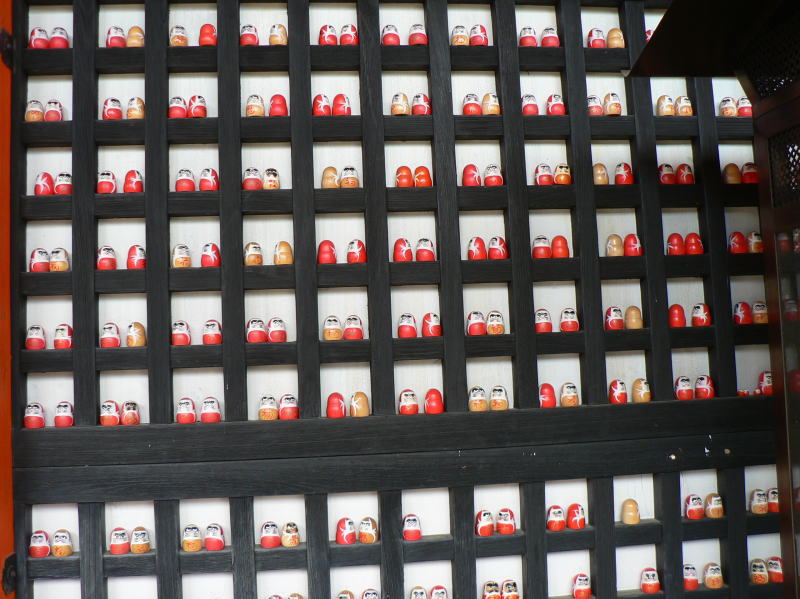 本堂の扉の桟にも無数の勝運祈願の勝ちダルマ |