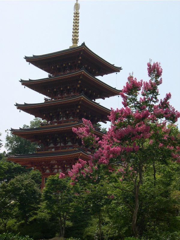 真夏の太陽を浴びて咲く満開の百日紅と五重塔