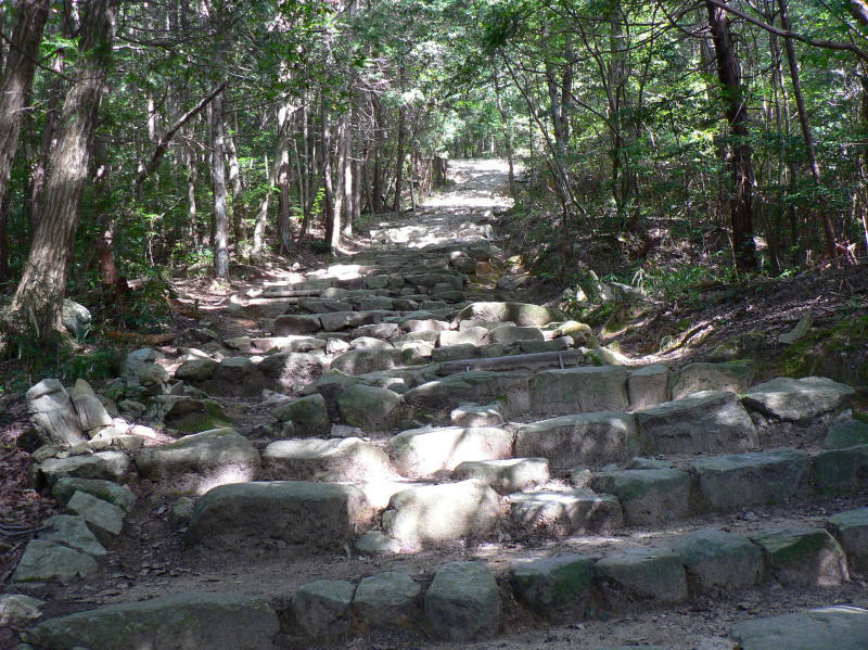 自然石を並べた石段や急な坂道が続く