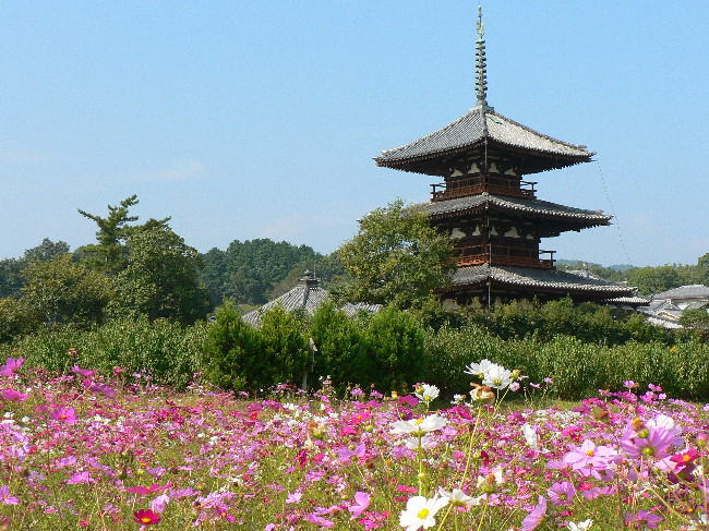 コスモス畑に囲まれた法起寺の三重塔