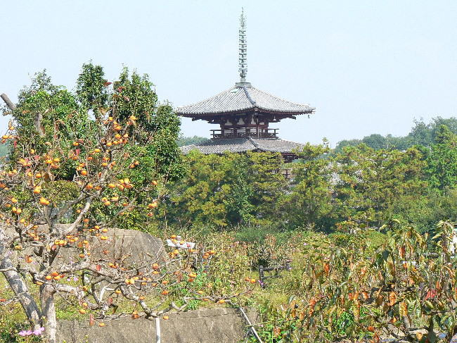 柿の木畑から眺める法輪寺の三重塔